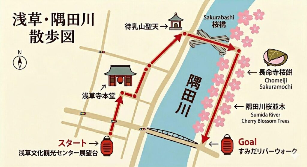 浅草文化観光センター展望台 → 浅草寺 → 待乳山聖天 → 長命寺桜餅 → 隅田川桜並木 → すみだリバーウォーク