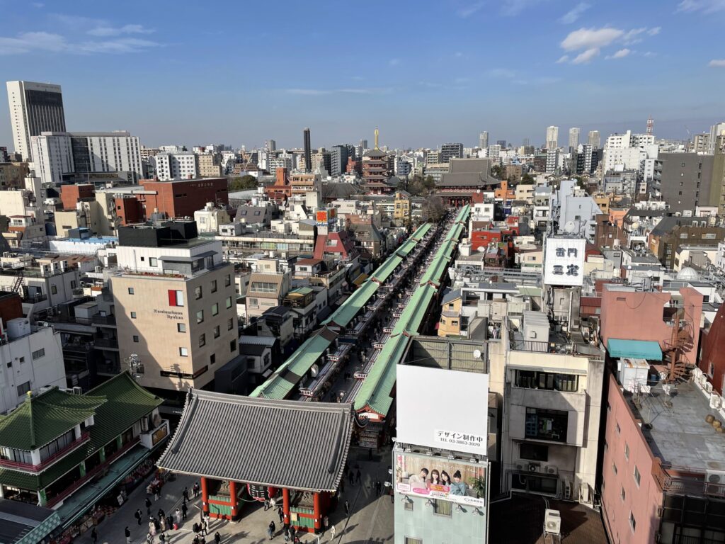 この日はエレベーターに長蛇の列ができていましたが、実際に乗るまで5分ほどで意外とスムーズでした。上からは仲見世通りの商店街から浅草寺の街並み、遠くまで見渡せる絶景が広がっていて、浅草に来たらまず立ち寄ってほしいスポットです。